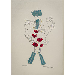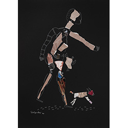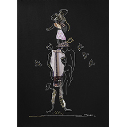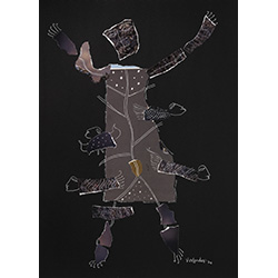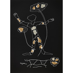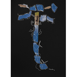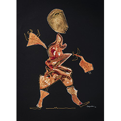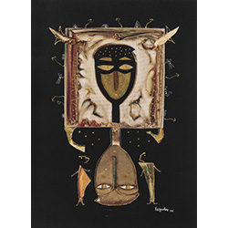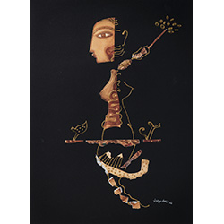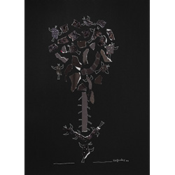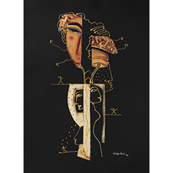 Vasudev works in various mediums: Drawings, Paintings, Reliefs in copper, Tapestries in silk and collages. He became well-known for his ”Vriksha”, Tree of Life series, which evolved over nearly a decade, turning into the Tree of Life and Death in the latter half of the 1980s. He also explored the theme of “Maithuna”, Act of Love, through a series of drawings, paintings and copper reliefs. Eventually his tree grew into faces titled “Humanscapes” and “Earthscapes”. The tree is still sometimes visible in his series titled “Theatre of Life” and “Rhapsody”.